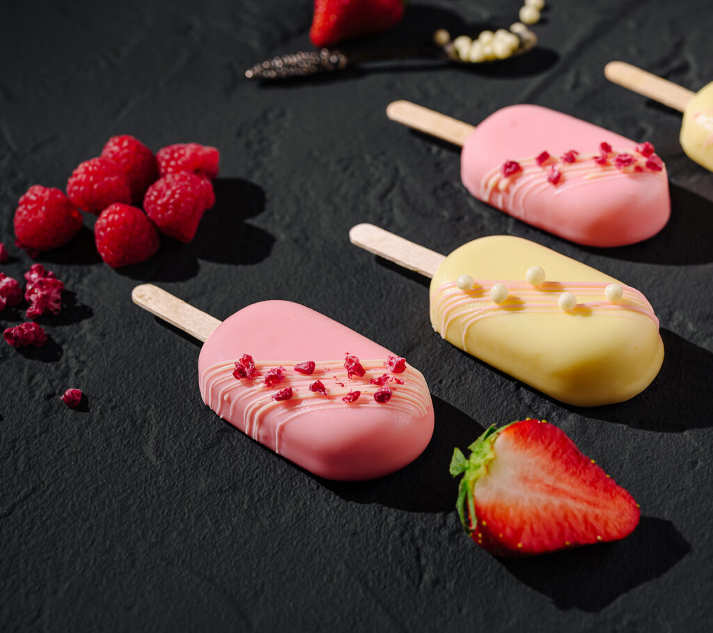 Cakesicles: nowoczesna wersja cake popsów – większe, w formie lodów na patyczku. Elegancko zdobione, często w kolorystyce dopasowanej do okazji np. komunii, chrztu czy wesela.